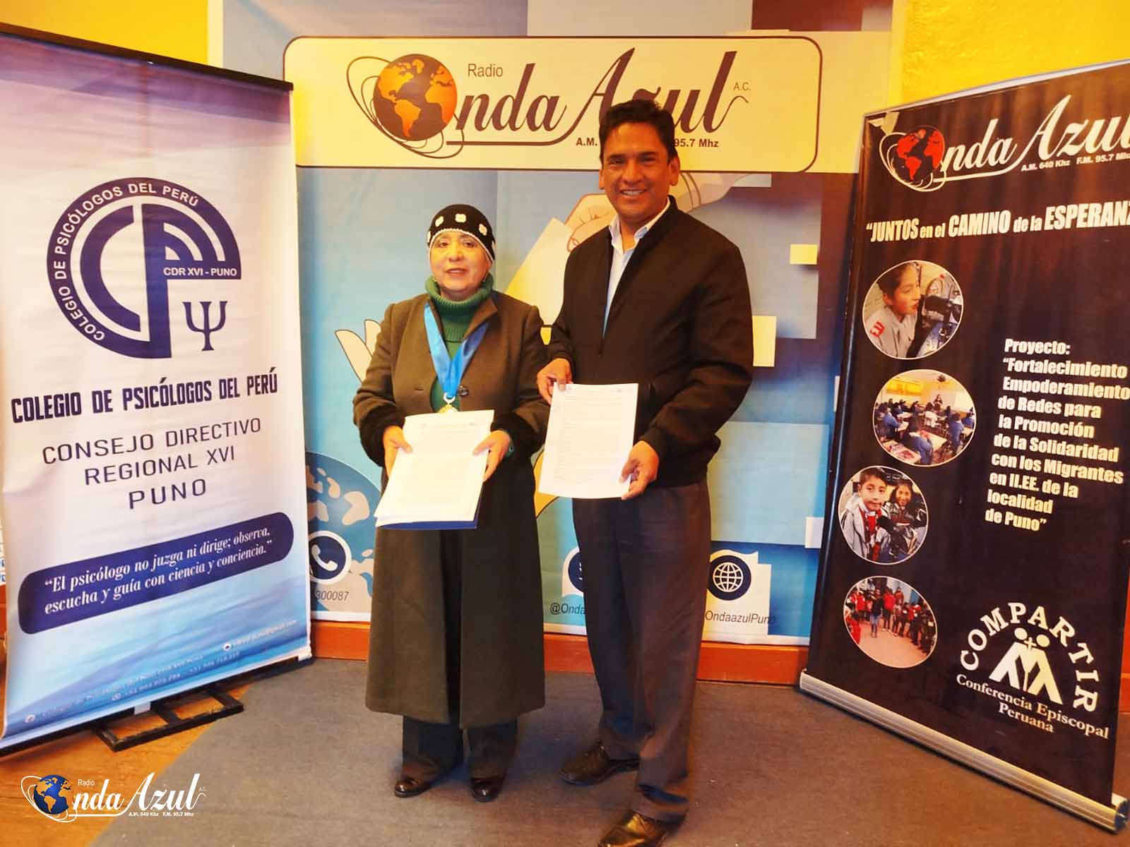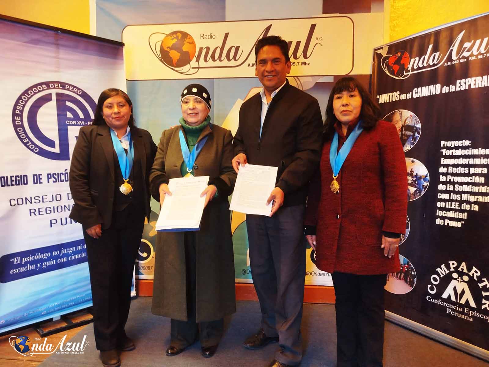 Colegio de Psicólogos del Perú – Consejo Directivo Regional XVI – Puno y Radio Onda Azul suscriben convenio de cooperación interinstitucional. Esta alianza busca promover la salud mental y el bienestar emocional de la población mediante actividades de proyección social.